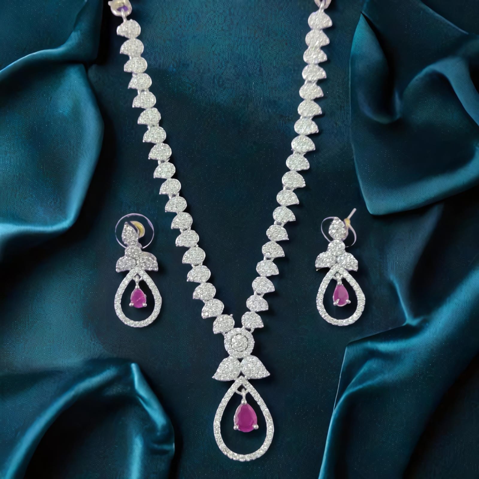 Rhodium plated simple yet stunning, white stone necklace highlights the ruby pendant perfect for making a subtle yet stylish statement