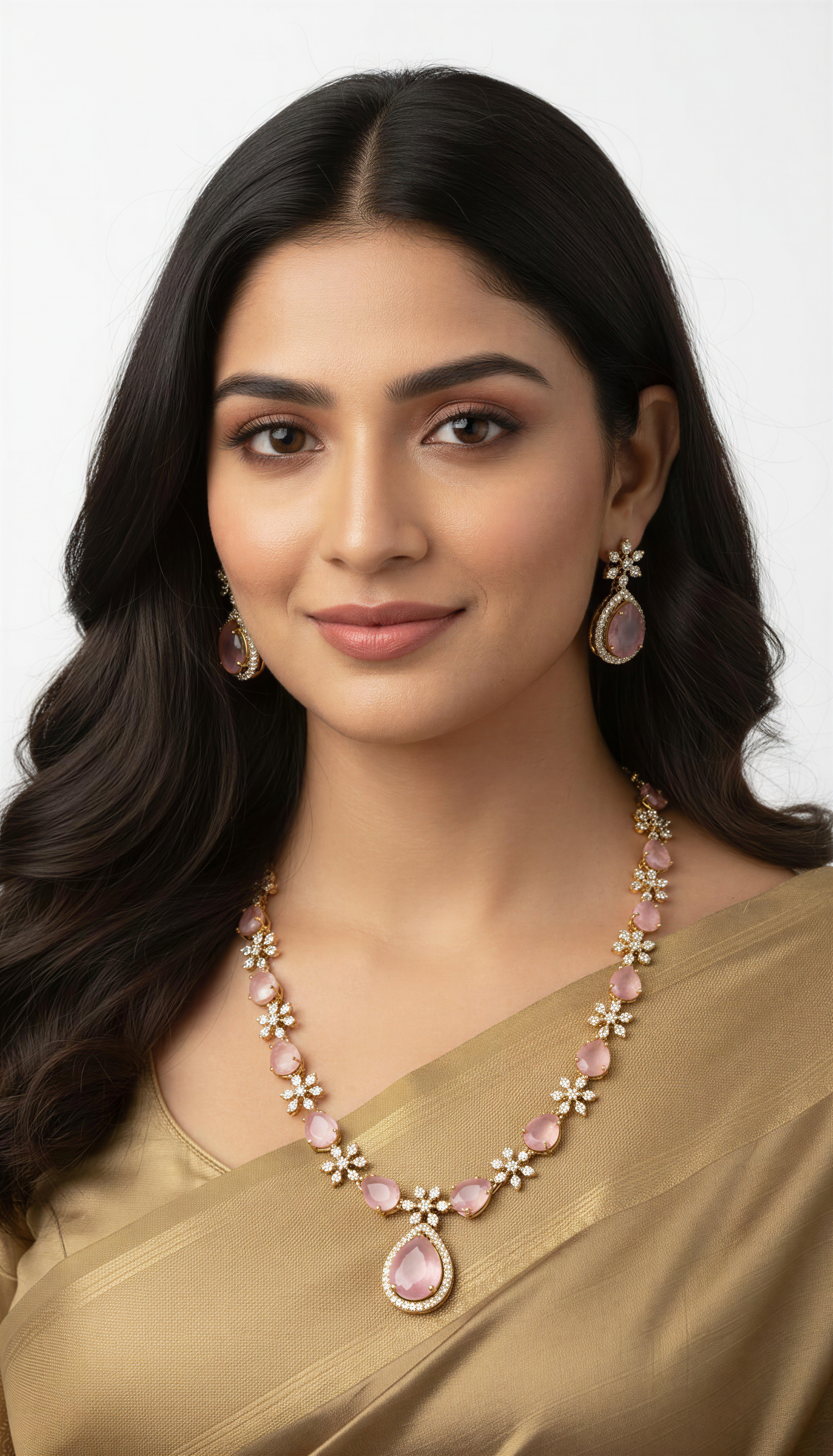 Elegant teardrop Necklace with cz white stones crafted with precision that radiates timeless elegance displayed in 3 colours white, green and pink. Must have for a special gathering.