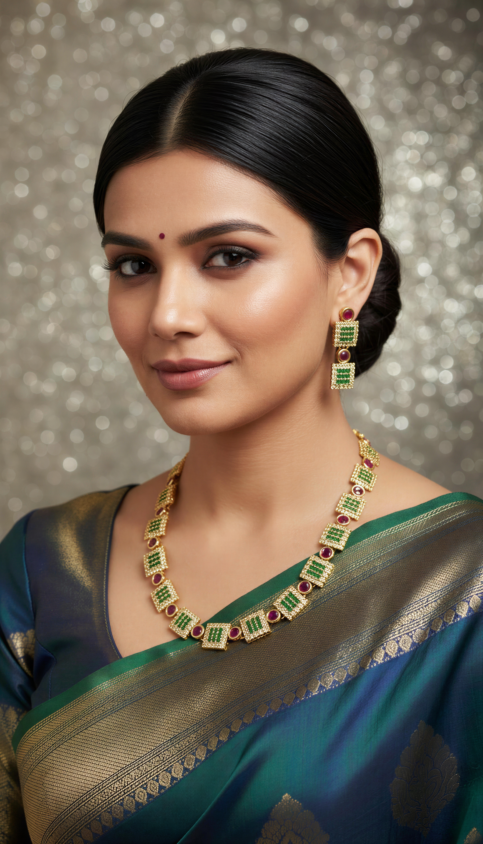 The Zyra Square Motif AD Necklace exemplifies modern luxury through its sophisticated design and superior craftsmanship. Featuring premium moissanite stones set in high-quality gold and platinum metals, this piece delivers exceptional sparkle with minimal weight—ideal for extended wear. The distinctive square motif is enhanced by rich green ruby accents, creating visual depth and contemporary appeal. Engineered for versatility, it transitions seamlessly from formal occasions to refined everyday styling. The lightweight construction ensures comfort without sacrificing presence, while the premium materials guarantee lasting brilliance and durability for the discerning collector.